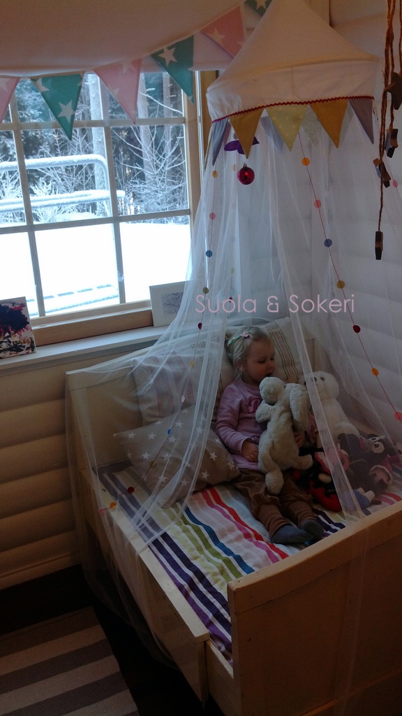Ja niistä käsitöistä, niin ikkunassa on ompelemani viiri, pöydän alatasolla äitini virkkaamia legokoreja, sängyssä kaksi erilaista tyynyliinaa jotka olen ommellut, lipaston päällä ompelemani kaitaliina, sängyn päällä äitini virkkaama tilkkupeitto, naulakossa äitini tekemä lorupussi ja seinällä Anna-kummin maalaama muumitaulu! <3 Ja kunhan saan pestyä yhden kankaan, niin ompelen kaksipuolisen ihanan päiväpeiton sängylle. Eli kaikenlaista löytyy!